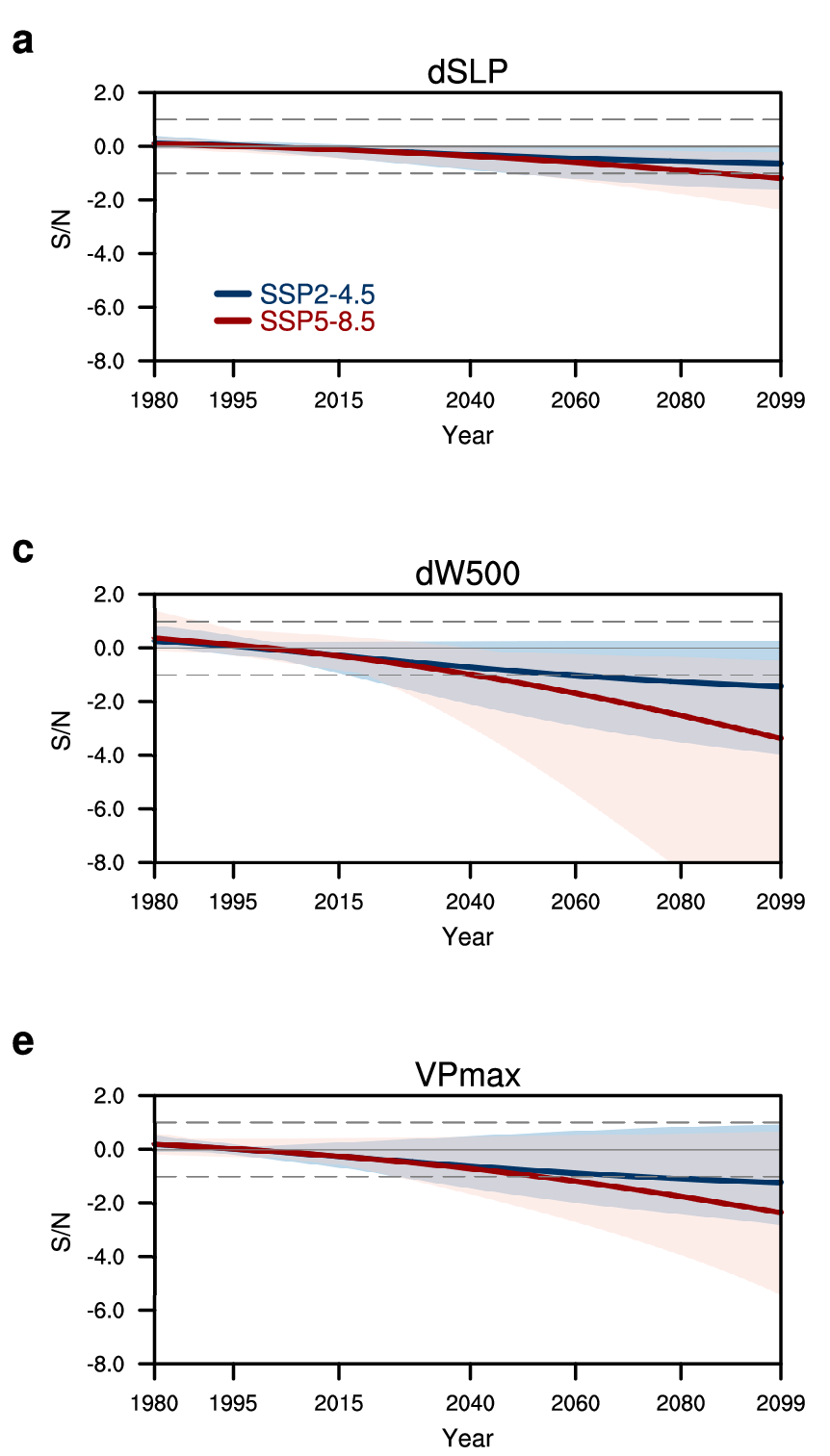 图 基于不同高度层指标揭示的不同排放情景下1980–2099年人为沃克环流变化的信噪比。当信噪比大(小)于1(-1)时,人类活动的影响可以被检测到。