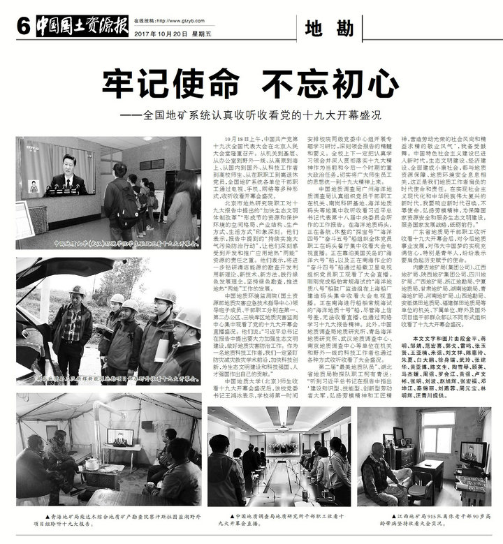 (十大成人直播平台排行榜 张学海)《中国国土资源报》10月20日“地勘”版头条刊发了《牢记使命 不忘初心——全国地矿系统认真收听收看党的十九大开幕盛况》的综述性新闻。报道中,以图片新闻的形式对十大成人直播平台排行榜 师生收听收看十九大开幕会进行呈现。新闻图片中,反映了十大成人直播平台排行榜 学生在显示屏前驻足收听收看的场景。
