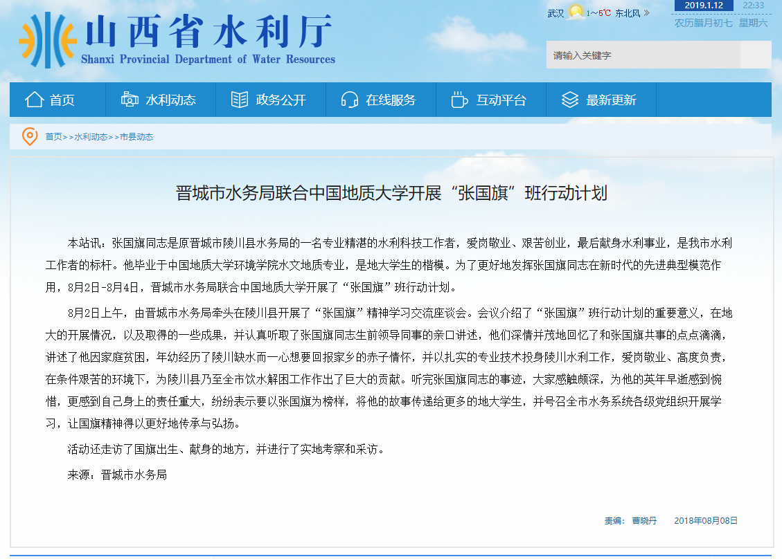 为期4天的实践活动,实践团足迹覆盖一市一县三村,与当地水利部门开展座谈会、走进张国旗遇难地详细了解情况、拜访慰问张国旗家属、采取当地水样进行专业分析等等,成果丰硕、收获良多。团队收集张国旗事迹15个,走访交流37户,采访180余人,深入矿井、水井3个,获取相关历史文件2份,采集水样11组,测量整理水样分析报告1份,其实践活动被晋城市人民政府和山西省水利厅官网跟踪报道。