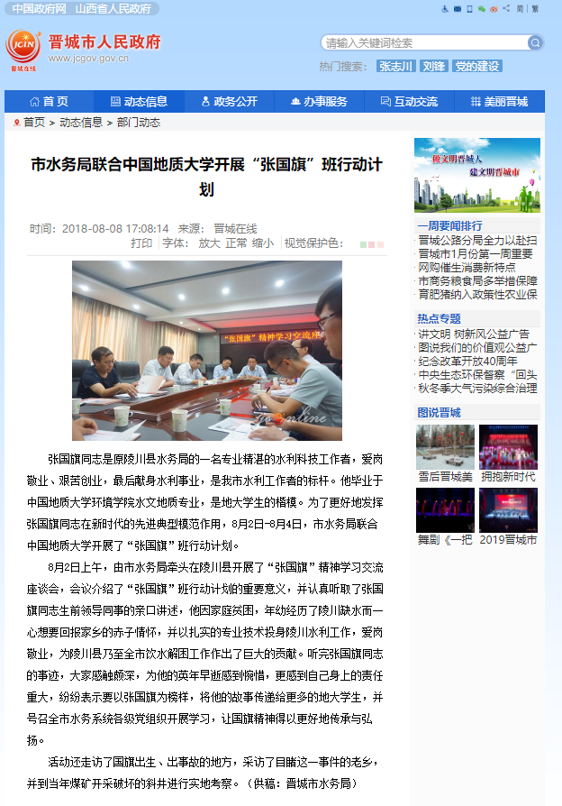 高旭波副教授带队,由陈柳源、蒋欧元、王立诚、陈雪杨、傅悦、贾旭东、郑洋7名环院学子组成的张国旗班实践团走进优秀校友张国旗的故乡——山西省陵川县开展社会实践,追寻张国旗足迹,讲述张国旗故事,弘扬张国旗精神。