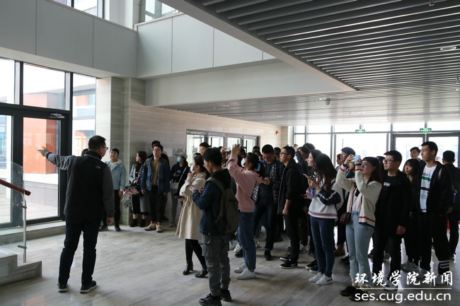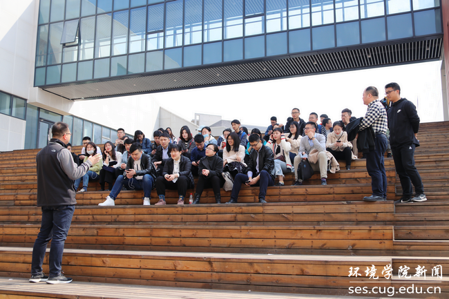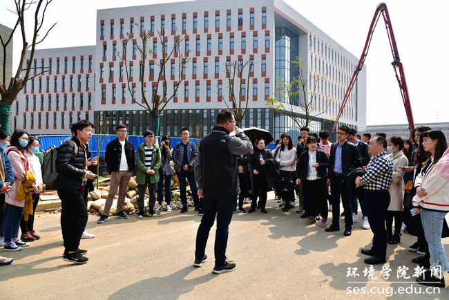 晋曦代表中国地质大学未来城校区管理办公室对大家的到来表示欢迎,带领学生以环境楼为起点,绕学校环荫路一周详细地为同学们介绍了新校区的功能布局和整体规划,重点讲解了学生关心的学、吃、住、行等相关问题,并结合学生提问为同学们答疑解惑。