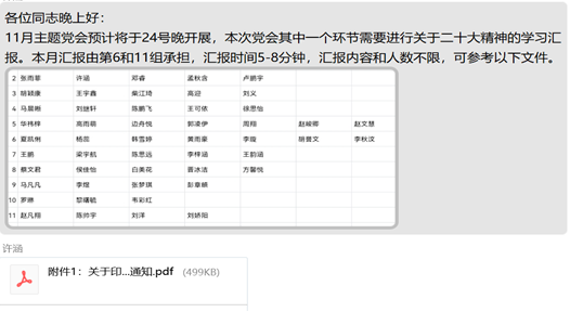 二是落实“三会一课”,做到教育党员有力。支部始终以丰富的内容为核心、以形式多元的特色活动为载体,坚持探索并优化组织生活模式。支部每月召开主题党日活动,采用集中学习和个人自学、线上与线下、理论与实践相结合的方式,深学思悟。在支部活动中,通过前期动员,小组讨论汇报,集中学习探讨等形式,调动支部党员的积极性和主动性,取得良好成效。