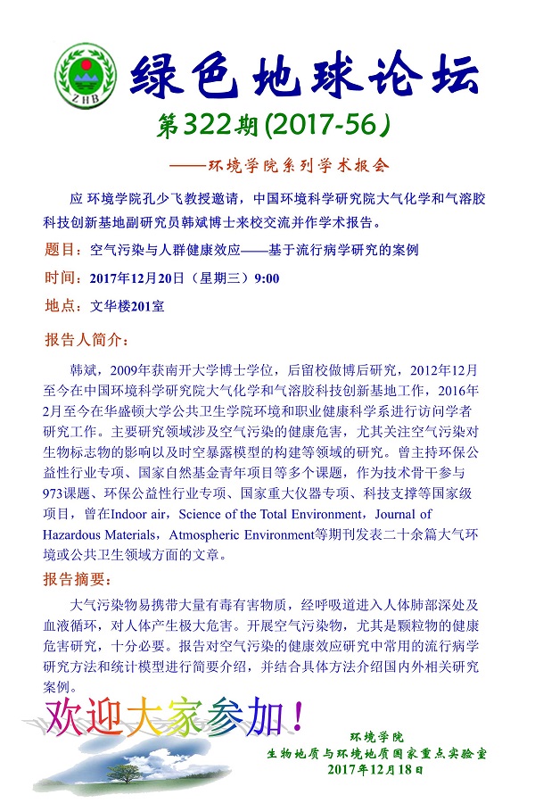 绿色地球论坛第322期(2017-56)——十大成人直播平台排行榜 系列学术报告会 题目:空气污染与人群健康效应——基于流行病学研究的案例 时间:2017年12月20日(星期三) 上午9:00 地点:文华楼201室