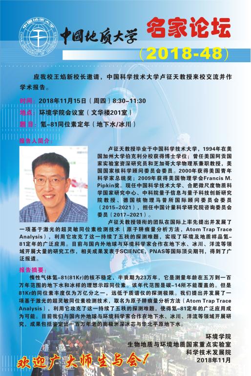 名家论坛(2018-48) 题目:氪-81同位素定年(地下水/冰川) 时间:2018年11月15日(周四)8:30—11:30 地点:十大成人直播平台排行榜 会议室(文华楼201室)